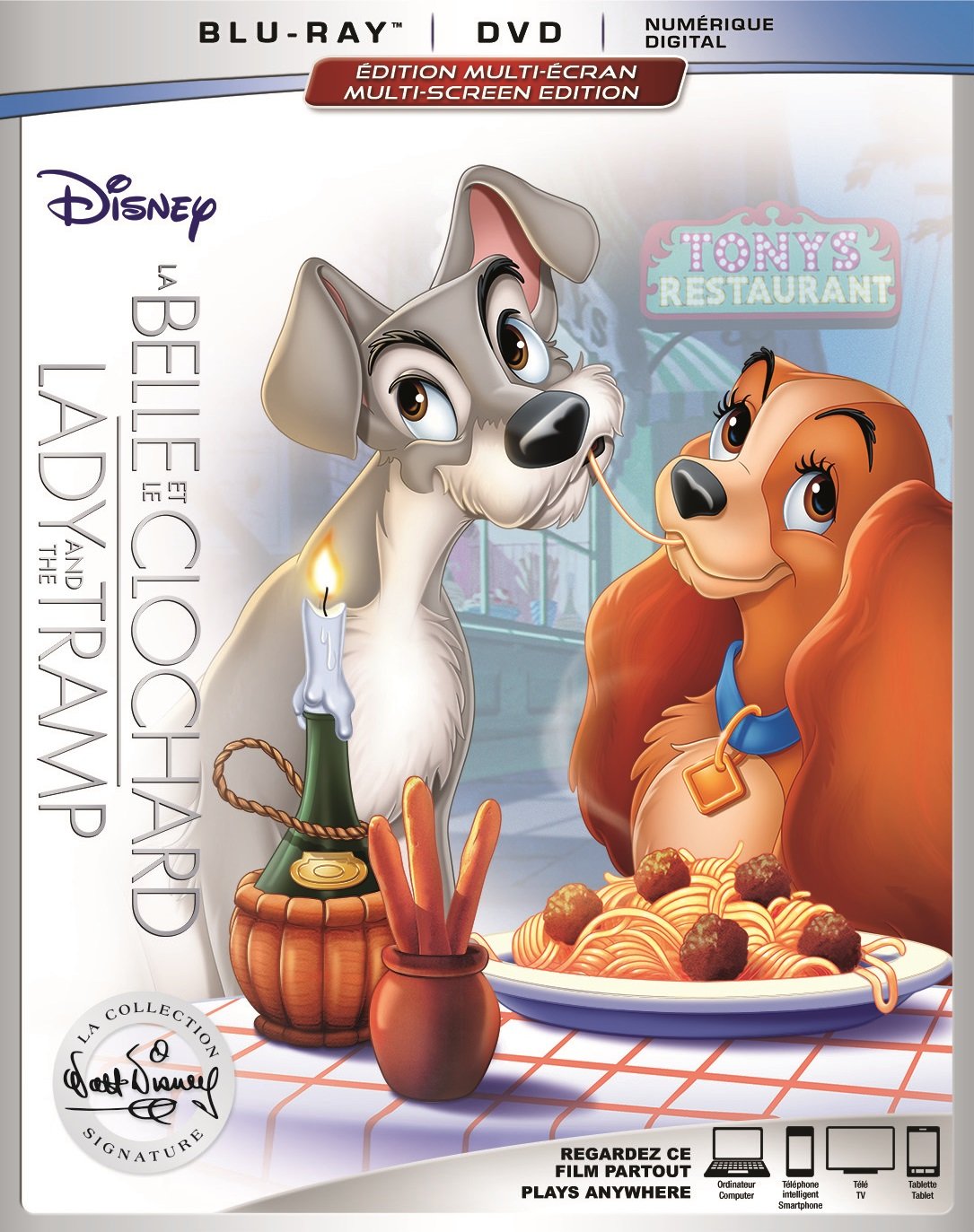La collection signature Walt Disney porte son total à six films avec la sortie du classique de 1955, "Lady and the Tramp". Encore une fois, Disney nous propose un ensemble comprenant la version Blu-ray, DVD et numérique du film. Cette version numérique est une première pour ce film. Comme pour les cinq premiers films de la collection, on retrouve un transfert vidéo et une piste audio inchangés par rapport à sa précédente sortie, qui faisait partie de la collection diamant de Disney parue en 2012.
