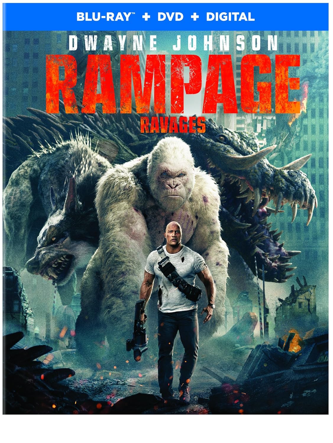 Le film débarque dans les magasins dans un ensemble de deux disques offrant une version DVD et Blu-ray. La pochette donne le ton avec une magnifique image qui réunit les trois montres avec le personnage de Johnson à l'avant. Le menu tombe dans la simplicité avec une image fixe, sans musique et les options au bas de l'image. Au niveau technique, "Rampage" frappe un grand coup avec un transfert vidéo solide et une piste originale qui nous fait entrer dans l'action. Des couleurs vives, un souci du détail très soigné, des contrastes forts et une belle profondeur sont les principaux atouts du côté de la vidéo. Pour ce qui est du son, tout est bien rendu, les effets spéciaux, la musique, les dialogues nous sont bien livrés. C'est une piste très bien remplie, surtout lors de la scène finale et tout est audible distinctement, même si la cacophonie règne, on ne manque rien.